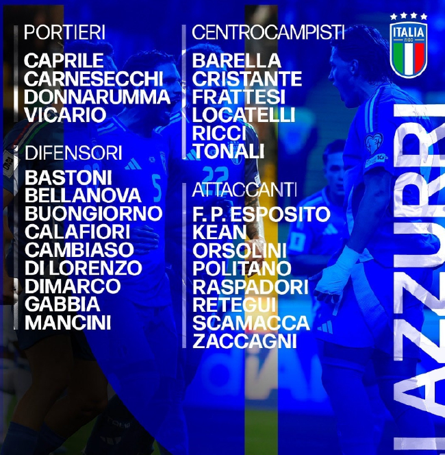 意大利国度队公布了11月外洋比赛日历间的大名单,多纳鲁马领衔,萨穆埃莱-里奇、斯卡马卡、布翁焦尔诺追想,卡利亚里门将卡普里莱初度入选。