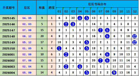 上期后区中奖号码为05 09,近10期后区玄虚奇偶比9:11,偶数出号占优,本期保举偶偶组合02,12。
