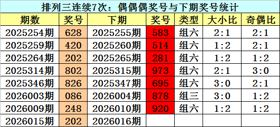 奇偶判断:上期成列三奖号为202,奇偶为:偶偶偶,近7次出现奇偶:偶偶偶奖号分袂为:628-420-202-802-826-086-248。