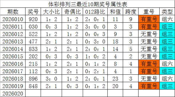 体彩罗列三最近10期别离开出奖号:920、030、522、477、833、202、215、112、896、848,各奖号属性详见下表: