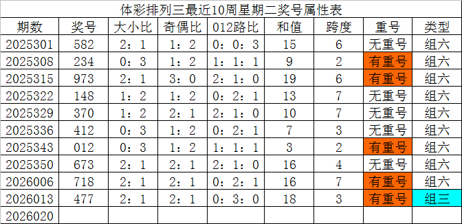 体彩罗列三最近10周星期二奖号别离为:582、234、973、148、370、412、012、673、718、477,各奖号属性详见下表: