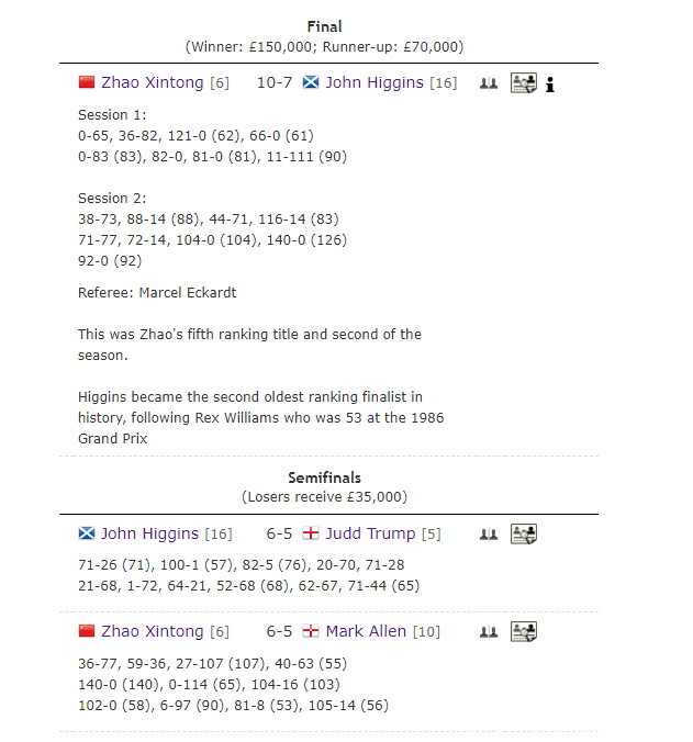 历程热烈争夺,赵心童、希金斯,与天下第一贾德-特鲁姆普、马克-艾伦打进四强。半决赛,赵心童对阵艾伦,希金斯迎战特鲁姆普。